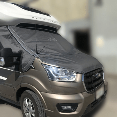 The OCD windscreen covers have been patterned for each vehicle type and are attached to the motorhome with four physical attachment points. The cover is mounted on the top corner of the driver's & passenger's doors. Customized leather surrounds fit around each of the side mirrors. A series of magnets along the back edge of the doors, under the windows and around the bottom edge of the bonnet add additional security for the cover. It is important to note, installation take just 3-4 minutes and a substantial carry bag is provided with each cover.
