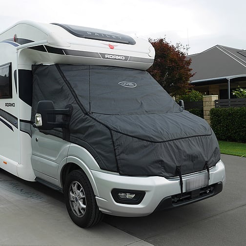 The OCD windscreen covers have been patterned for each vehicle type and are attached to the motorhome with four physical attachment points. The cover is mounted on the top corner of the driver's & passenger's doors. Customized leather surrounds fit around each of the side mirrors. A series of magnets along the back edge of the doors, under the windows and around the bottom edge of the bonnet add additional security for the cover. It is important to note, installation take just 3-4 minutes and a substantial carry bag is provided with each cover.