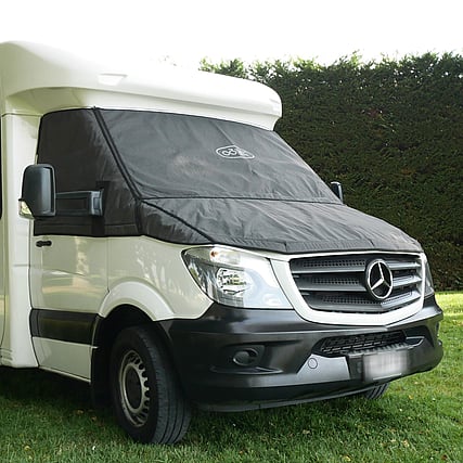 The OCD windscreen covers have been patterned for each vehicle type and are attached to the motorhome with four physical attachment points. The cover is mounted on the top corner of the driver's & passenger's doors. Customized leather surrounds fit around each of the side mirrors. A series of magnets along the back edge of the doors, under the windows and around the bottom edge of the bonnet add additional security for the cover. It is important to note, installation take just 3-4 minutes and a substantial carry bag is provided with each cover.